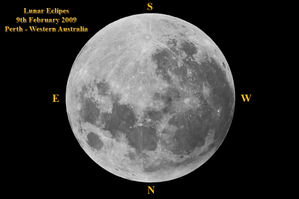 Comments Lunar Eclipse - 9th January 2009 Many penumbral eclipses have few observable effects. The penumbral area is the partial shadow of the earth on the moon. This lunar eclipse carried the moon far enough into the light gray shadow to produce a dimming of the northern lunar limb. According to NASA, this event will be the deepest penumbral eclipse in 2009, with a penumbral magnitude of 0.899. It was visible to the naked eye as dusky shading in the northern half of the moon. I have not displayed the moon in the conventional manner, instead it's shown as seen from the southern hemisphere so the moons south pole is at the top of the image whilst east is on the left. |