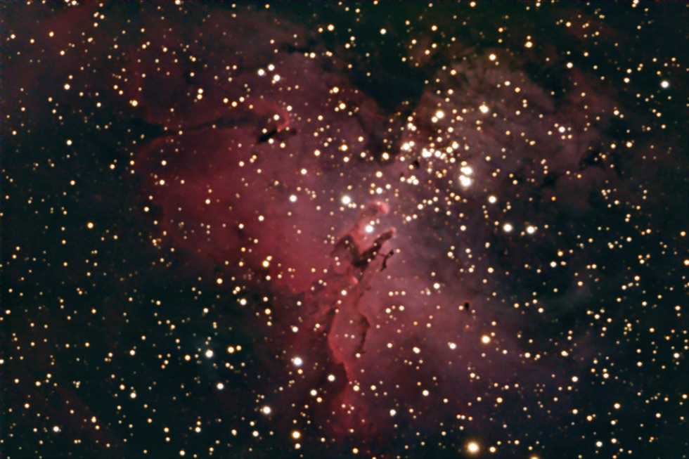 The Eagle nebula is a emission nebula and open star cluster.  It contains those famous Hubble Space Telescope images of the "Pillars Of Creation", which are columns of cool hydrogen gas and dust protruding from a molecular cloud.  New stars are being formed in these clouds.