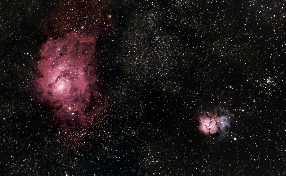 Name: Lagoon (M8), Tifid (M20) Nebula's & Open Star Cluster M21 This imagine is made up from about 80 images, making two FOV's one each for M8 & M20 then stitched together to increase the FOV. M21 forms an apparent group in the sky with M20 and M8. But in real space, M20 is a foreground object, while M8 is not much farther away than M21. M21 is 3,930 ly, whist M20 is 2,660 ly and M8 is between 4,000 to 6,000 ly from earth.