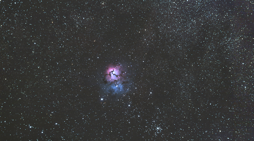 In a physical sense, M20, the threefold or Trifid Nebula, rather consists of two components: the round central H-II region, glowing in red Ha light, is surrounded by the blue halo of a reflection nebula.