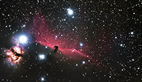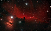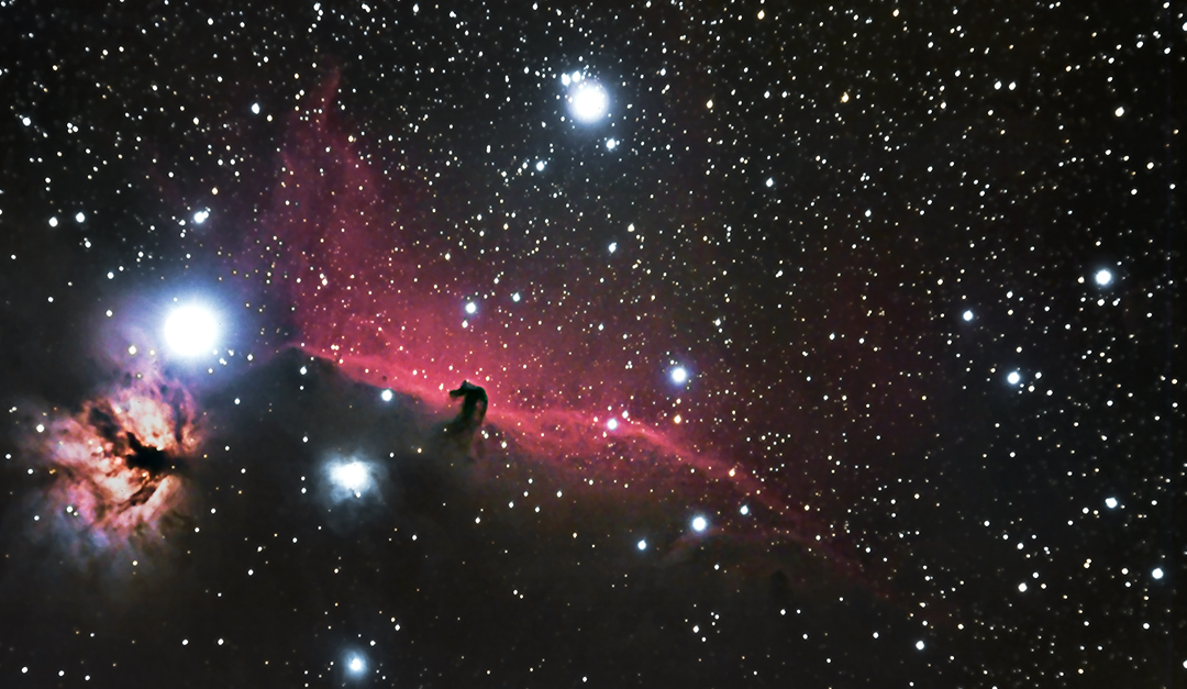 The large blueish star to the centre left is Alnitak.  The rightmost star (from southern hemisphere) of the belt of Orion.  Below Alnitak is the "Flaiming Tree" nebula, NGC2024.  To  the right of Alnitak is the famous  dark dust in the shape of a horse head,  Barnard 33.   The horse head nebula is 1,400 light years from earth.  This lies in front of  the large whispy red emmission nebula, IC434.