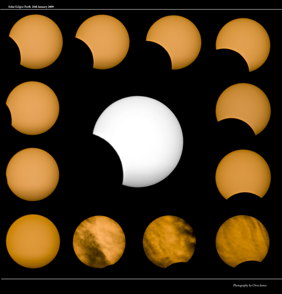 Comments These are the actual images taken of the Solar Eclipse. I took an image every 20 seconds, however for the image above I have chosen a image approx every 11 minutes to show the sequence from start to end. First Contact: - 5:01:41 PM Western Australian Daylight Savings Time Max - 6:.02 PM Western Australian Daylight Savings Time (Obstruction of the Sun by the Moon 22.2%) Last Contact - 6:56:16 PM Western Australian Daylight Savings Time I used a JMB Type A Solar Filter on the LX200R which results in the Sun being seen in a pleasing natural golden yellow colour. In this collage, I have represented the colour of the Sun at the centre of the collage as White, as its our colour reference for our visual word and if it where possible too look at it with our naked eyes, it would be white. The time shifted images around its centre is what the camera sees in relation to our colour reference caused by the Solar Filter. More facts on Eclipses can be found @ http://www.mreclipse.com/MrEclipse.html |