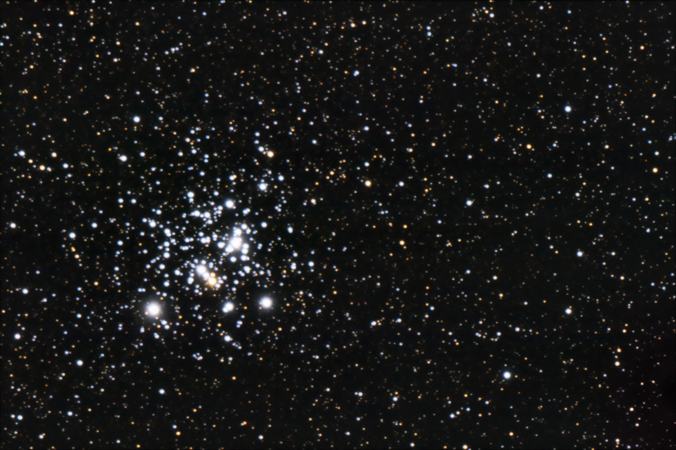| Camera: Canon 20D | Located one degree to the SE of Beta Crux. One of the bright central stars is a red supergiant, in contrast to the many blue stars that surround it. The cluster, contains just over 100 stars, and is about 10 million years old. Open clusters are younger, contain few stars, and contain a much higher fraction of blue stars than do globular clusters. The Jewel Box lies about 7500 light-years away, so the light that we see today was emitted from the cluster before even the Great Pyramids in Egypt were built. The Jewel Box, spans about 20 light-years, and can be seen with binoculars towards the southern constellation of Crux. | |