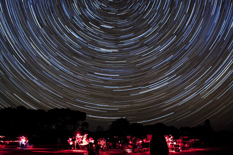 Name: Star Trails @ Watson's Way This is a time lapse image taken during a Dark Sky Observing visit to Watson's Way at Mukinbudin in Western Australia. http://www.atoz-visual.com/watsonsway/index.html/ The camera was set up to take continuious 30 second exposures whilst pointing south over the observers in the paddock. The 99 images where then combined with Startrails to make the image you see above.