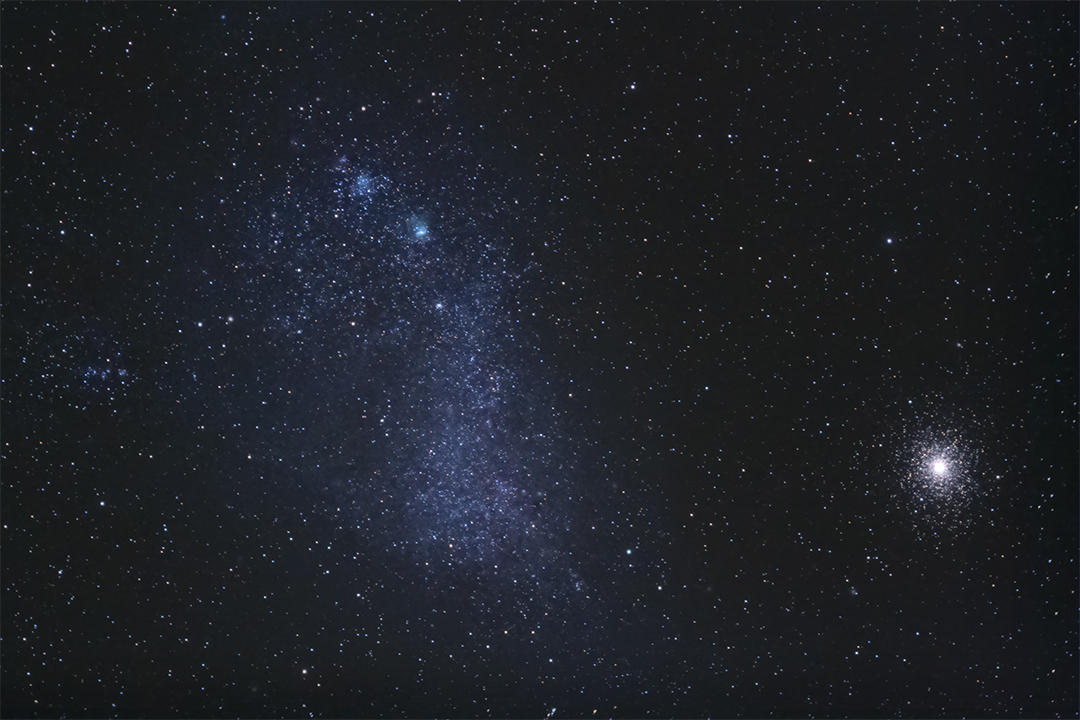 The SMC is visible from the entire Southern Hemisphere, but can be fully glimpsed low above the southern horizon from latitudes south of about 15 Degrees north. The galaxy is located across both the constellations of Tucana and part of Hydrus, appearing as a faint hazy patch resembling a detached piece of the Milky Way. The SMC has an average apparent diameter of about 4.2 degrees (8 times the Moon's) and thus covers an area of about 14 square degrees (70 times the Moon's). Since its surface brightness is very low, this deep-sky object is best seen on clear moonless nights and away from city lights. The SMC forms a pair with the Large Magellanic Cloud (LMC), which lies 20 degrees to the east, and like the LMC, is a member of the Local Group and highly probably is a former satellite of the Large Magellanic Cloud and a current satellite of the Milky Way.