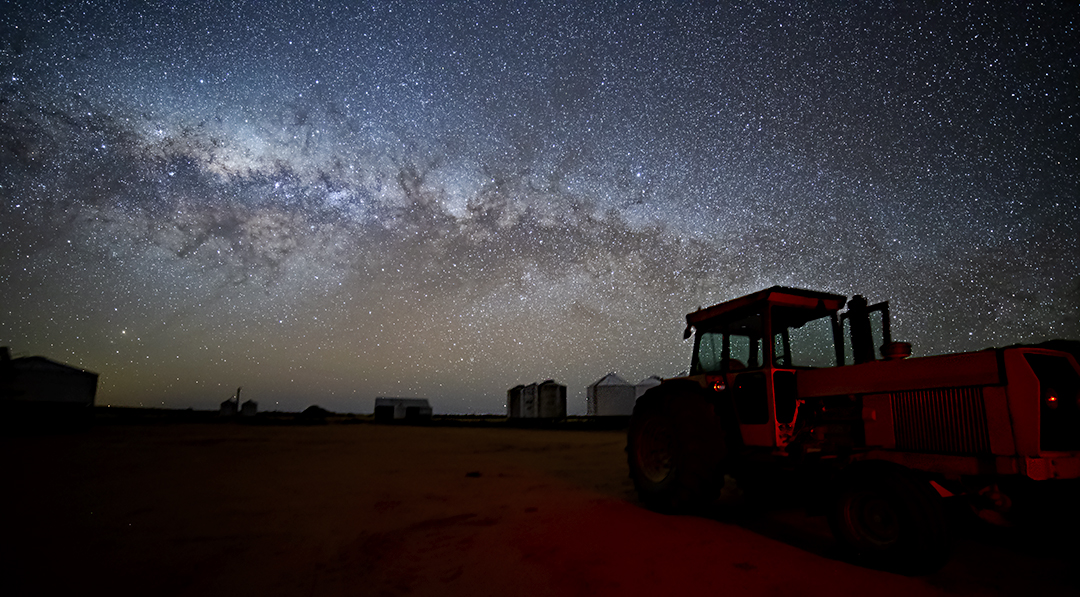 This imagine was done  with a single  exposure  of 2 minutes  at 3200 ASA.  The camera was mounted on a star tracker to prevent star trails  whilst the tractor in the foreground was  brefilly exposed  using a red tourch to prevent blurring by the star tracker movement.