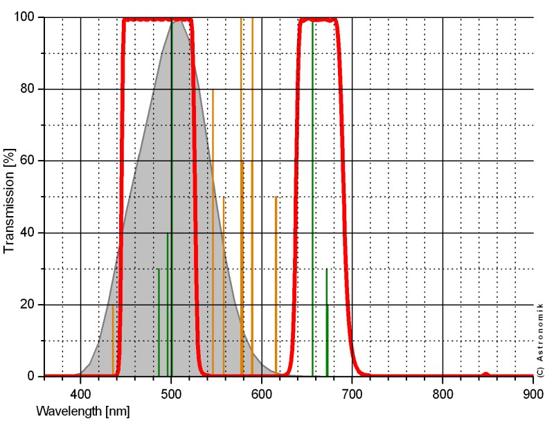 | Na 589,0nm | Na 589,6nm | Na 615,4nm | Na 616,1nm |The major emission lines of nebulas: H-β 486,1nm | OIII 495,9nm | OIII 500,7nm | H-α 656,3nm